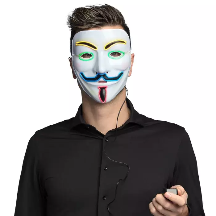 LED naamio Hakkeri. Hakkeri-naamio, jonka kasvot valaistuvat värivaloin. Valot saa palamaan kokoajan, tai vilkkuen kahdella eri nopeudella. Valot toimivat kahden AA-pariston voimin (ei sisälly pakkaukseen). Aikuisten one size koko, kuminauhakiinnitys. Materiaali muovia.