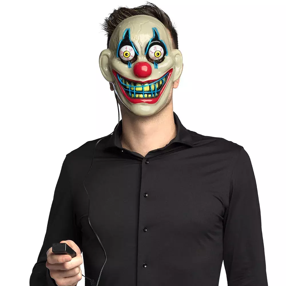 LED naamio Horror Clown, Halloween. Mulkosilmäinen Klovninaamari Led-valoilla, jotka valaisevat hampaat ja silmänympärykset. Valot saa palamaan kokoajan, tai vilkkuen kahdella eri nopeudella. Valot toimivat kahden AA-pariston voimin (ei sisälly pakkaukseen). Aikuisten one size koko, kuminauhakiinnitys. Materiaali muovia.