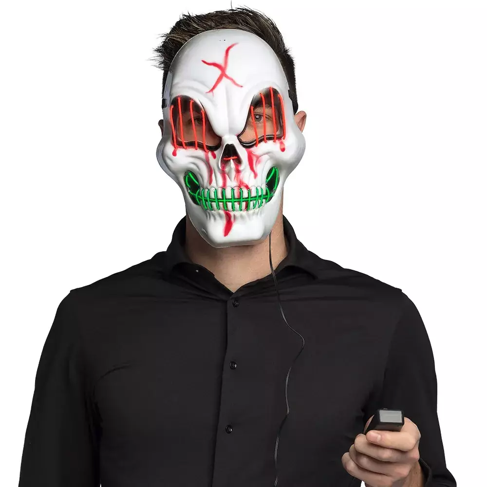 LED naamio Pääkallo. Kallo-naamio, jonka kasvot valaistuvat värivaloin. Valot saa palamaan kokoajan, tai vilkkuen kahdella eri nopeudella. Valot toimivat kahden AA-pariston voimin (ei sisälly pakkaukseen). Aikuisten one size koko, kuminauhakiinnitys. Materiaali muovia.