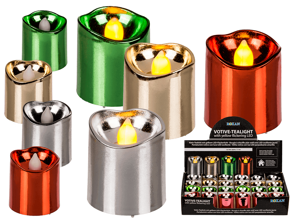 Led-tuikku (patterit sisältyy hintaan). Saatavana metallihohtoväreissä, punainen, vihreä, kulta tai hopea.Halkaisija 38 mm, korkeus 40 mm.