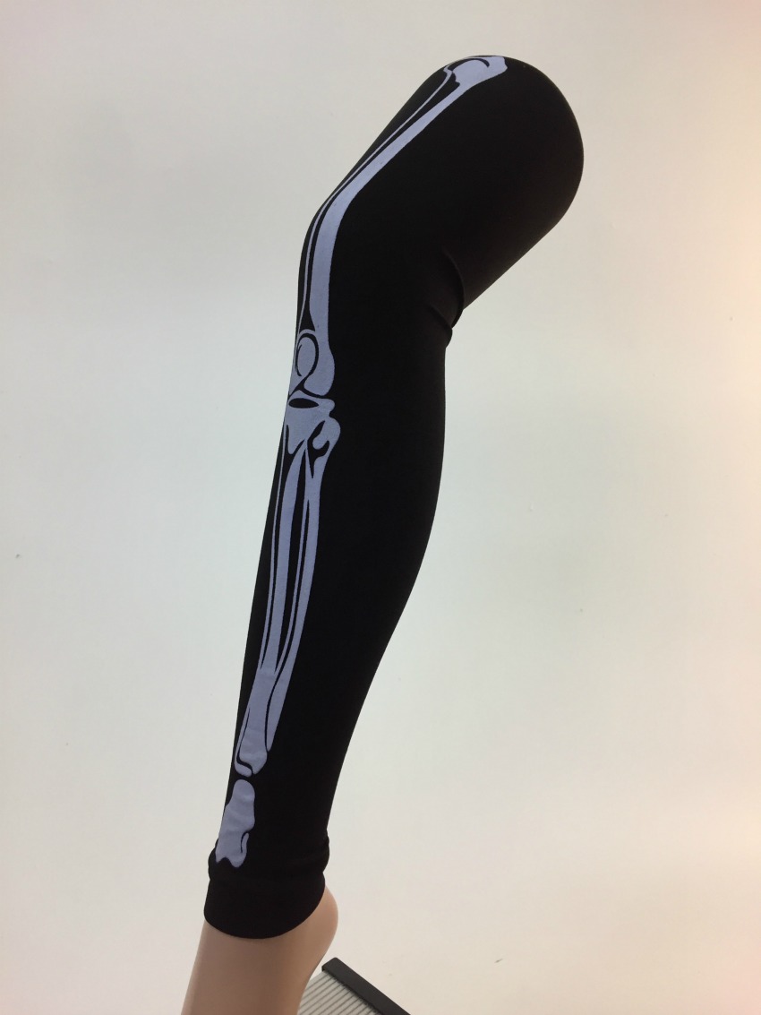 Leggingsit, Sääriluu, onesize. Upeat mustat leggarit valkoisella sääriluu kuvioinnilla. Vyötäröllä joustava kuminauha. Yhdenkoon leggingsit.