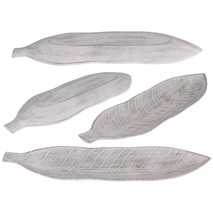 Valkoinen lehti, sisustustarjotin. Valkoiseksi maalattua, rustiikkisen näköistä puumassaa. Ei sovellu elintarvikekäyttöön. Mitat 53 x 16 cm.