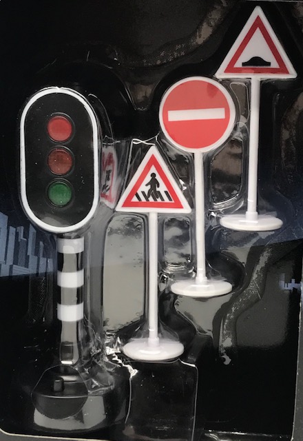 Liikennemerkkisetti. Sisältää kolme liikennemerkkiä ja liikennevalot. Sopivankokoisia pikkuautoleikkeihin ja automatoille. (Liikennemerkin korkeus 8 cm) Materiaali muovia.
