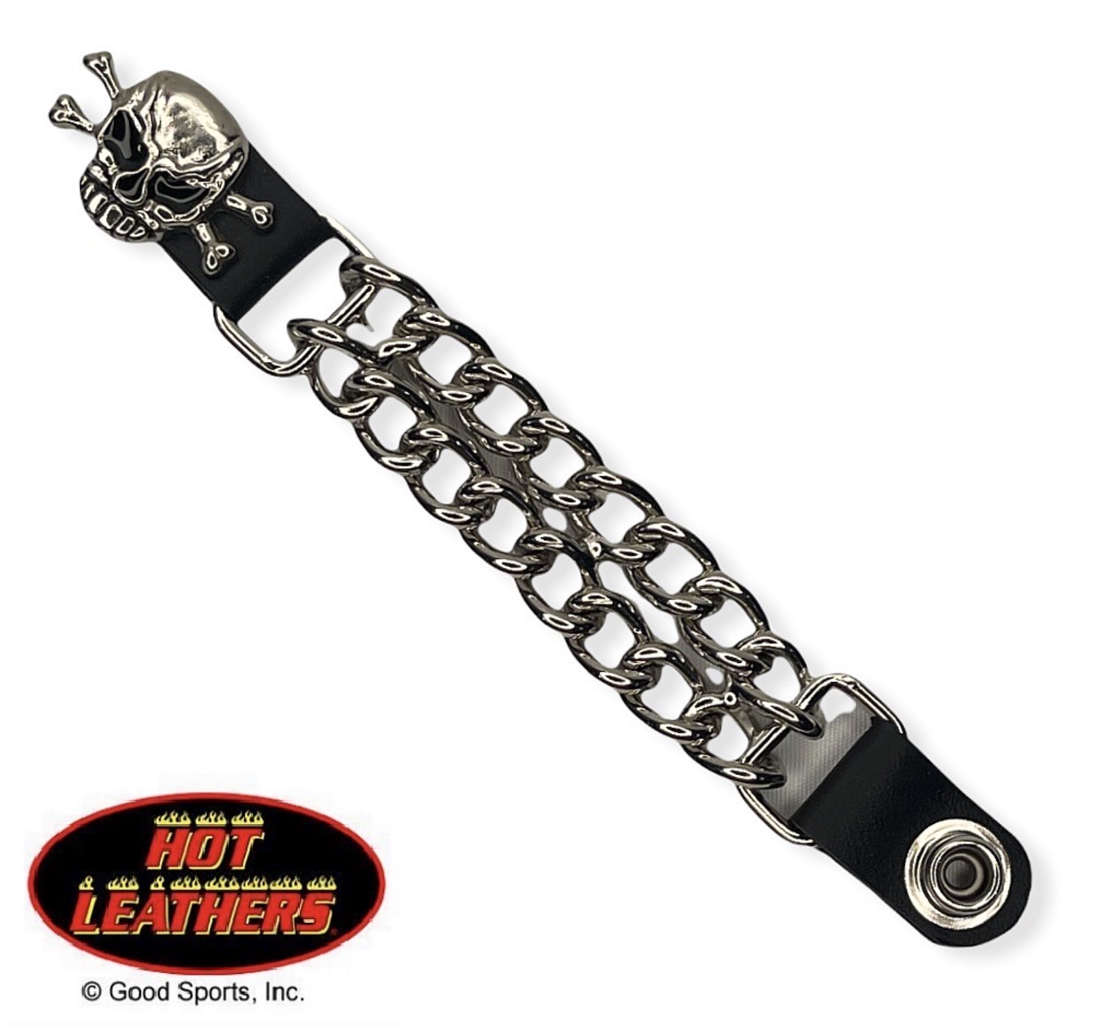 Liivilukko, Hot Leathers, Skull And Bones, 1 kpl. Hot Leathersin liivilukko, joka sopii kaikkiin neppariliiveihin eteen kiinnitykseksi. Yhteen liiviin tarvitset, nepparien lukumäärästä toki riippuen, yleensä neljä liivilukkoa. Ketjuosan pituus 4" eli n. 10 cm. Mitta nepparista neppariin on n. 14 cm.
