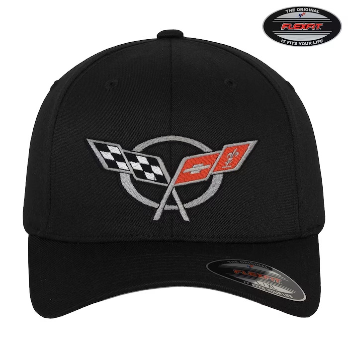 Lippis Corvette C5 Flags Flexfit. Kaarevalippainen, musta lippis.