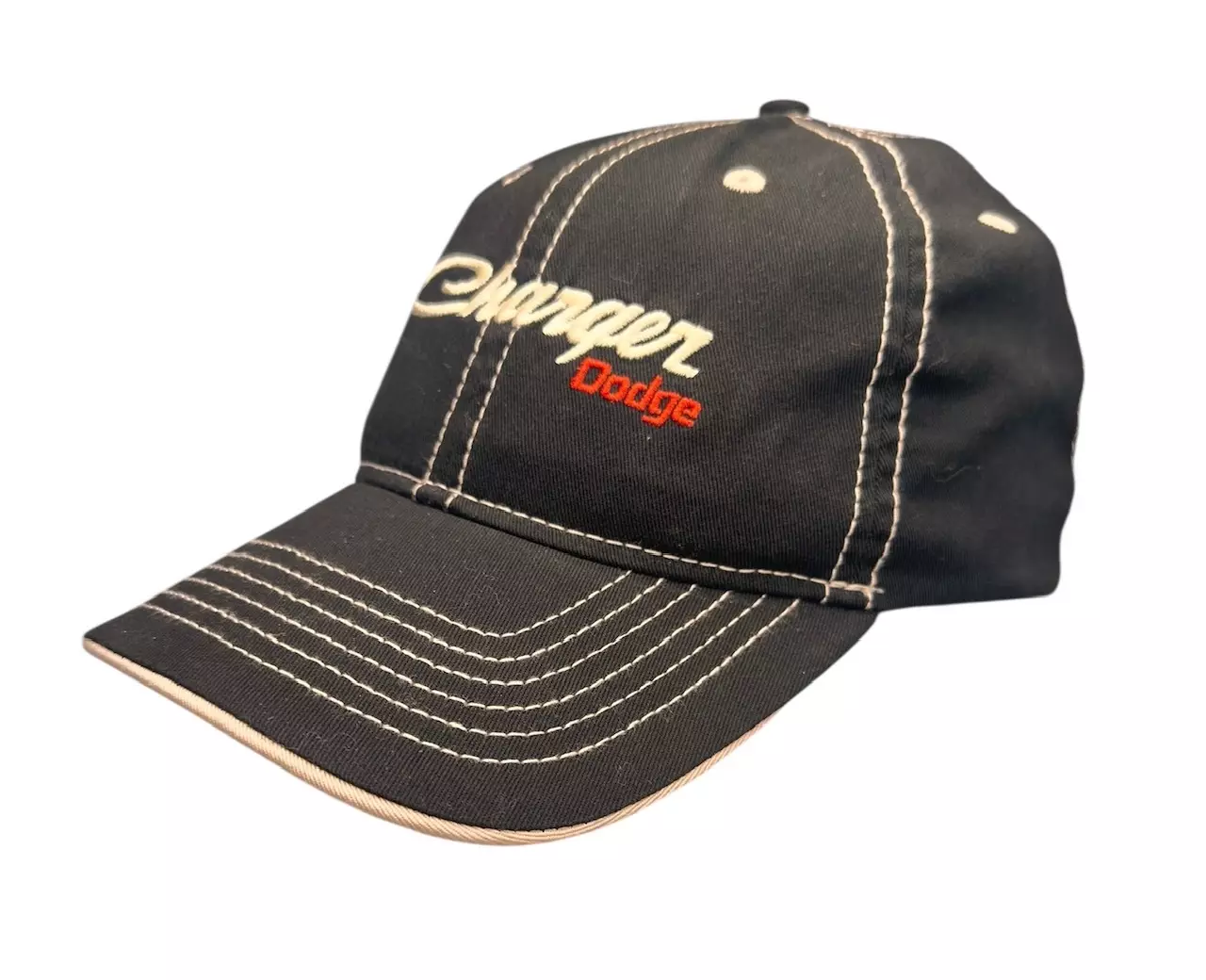 Lippis Dodge Charger. Musta kaarevalippainen lippalakki, jossa kontrastitikkaukset ja yksityiskohdat, lipan alaosan sävyllä. Säädettävä koko.