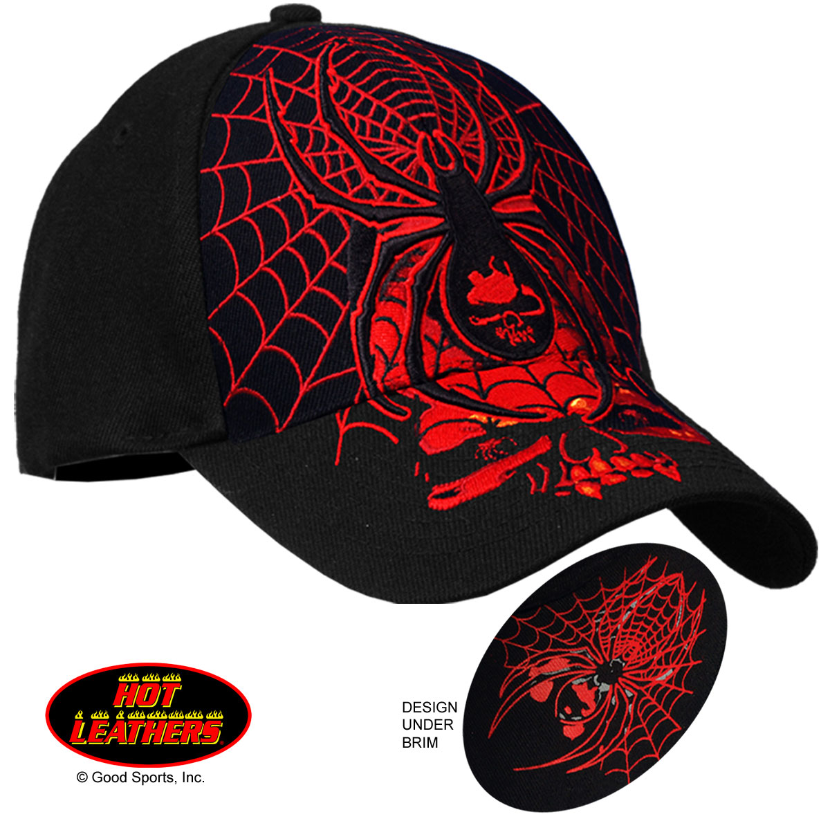 Raised embroidered Spider Skull and Web Biker Ball Cap - Direct embroidered design on a black adjustable 6 panel baseball hat. Black widow spider screenprint under bill. Curved bill and fully adjustable for a great fit.