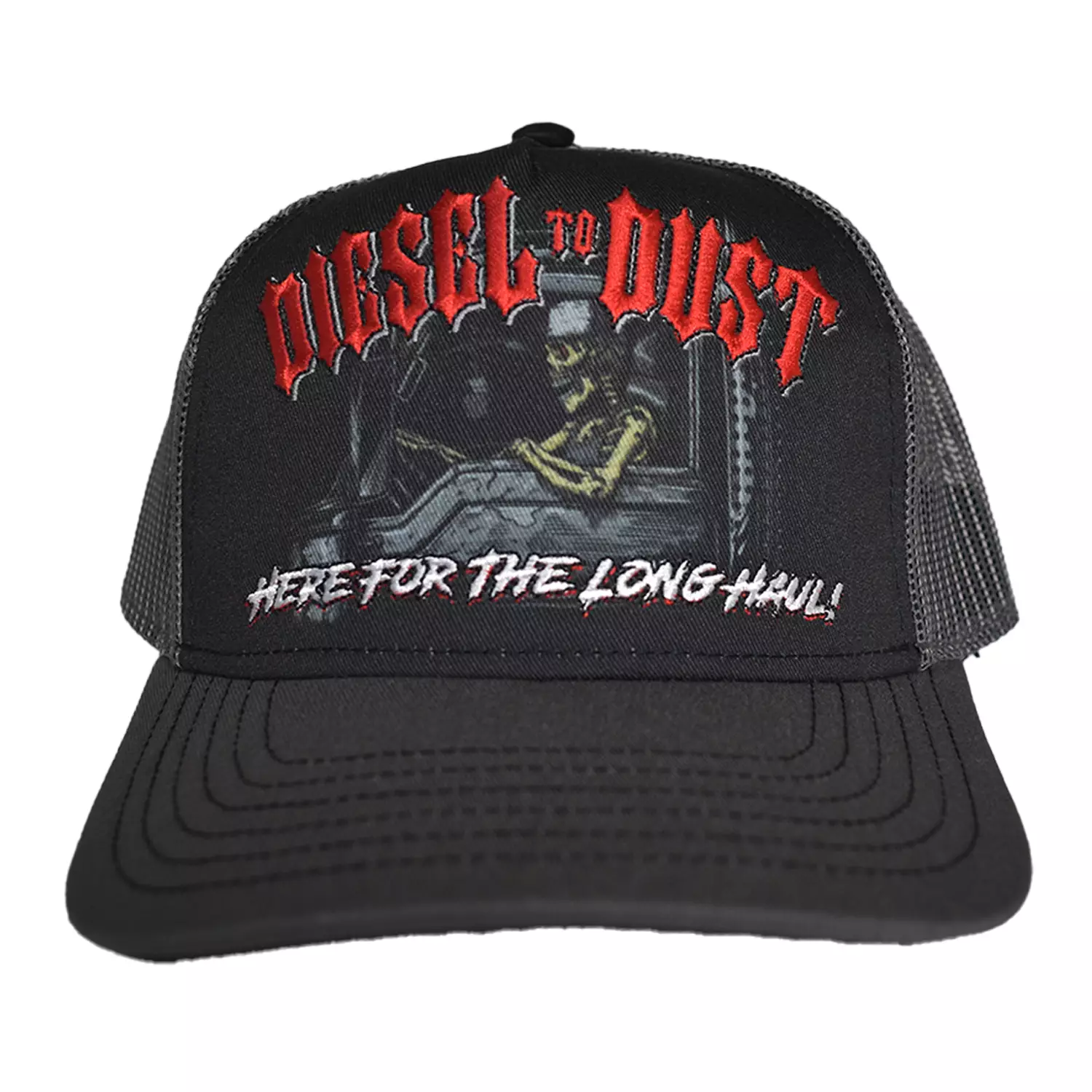 Letting Embroidery and vibrant trucker skull print is a must have for that trucker rolling down the road.