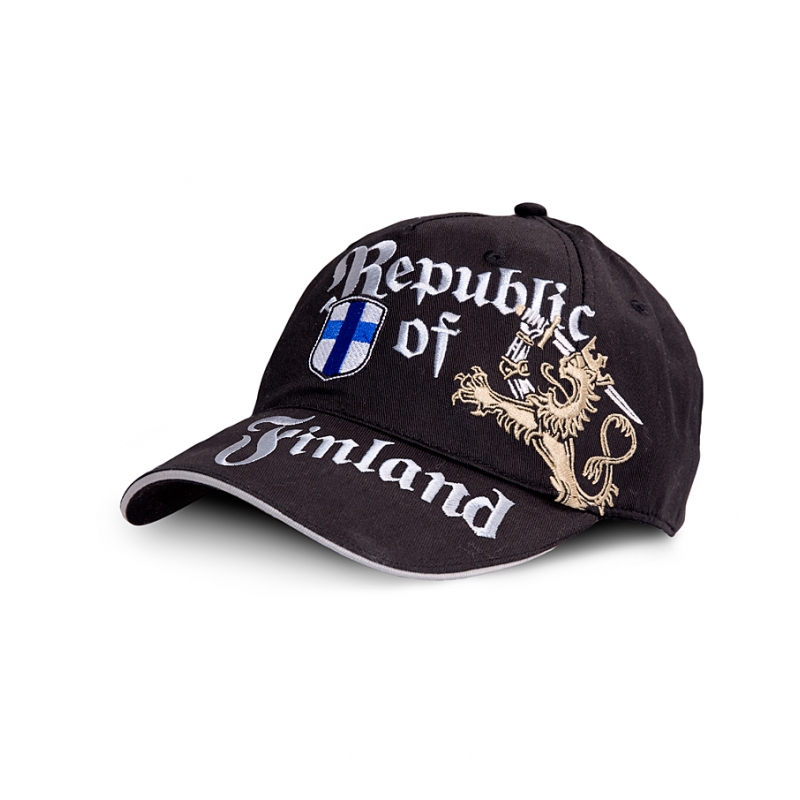 Lippis, Republic of Finland, Suomi Leijona. Brodeeratun lippiksen materiaali on 100 % puuvillaa. Yksi koko, säädettävä. Väri musta Ei vesipesua.
