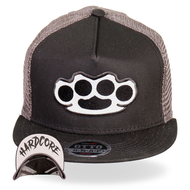 Lippis, Hot Leathers, Snapback, Brass Knuckle Hardcore. Musta/harmaa. Lipan alapuolessa kulutettu musta teksti HARDCORE. 100 % puuvillaa. Takana säätömahdollisuus.