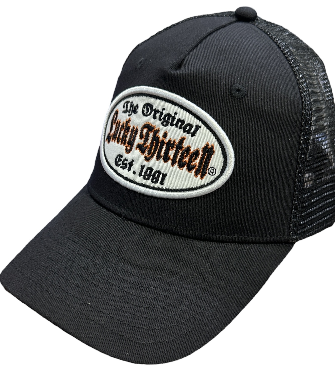 Lippis Snapback Lucky Thirteen. Musta, kaarevalippainen lippis, takaosa verkkoa. Snapback, säädettävä koko.