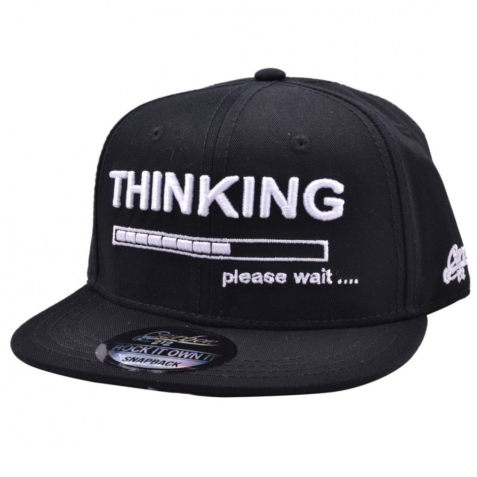 Lippis Snapback Thinking, Carbon 212 . Musta lippis. 100% puuvillaa. 3D brodeeraus. Snapback-säätömahdollisuus koosta 53 cm kokoon 60 cm.