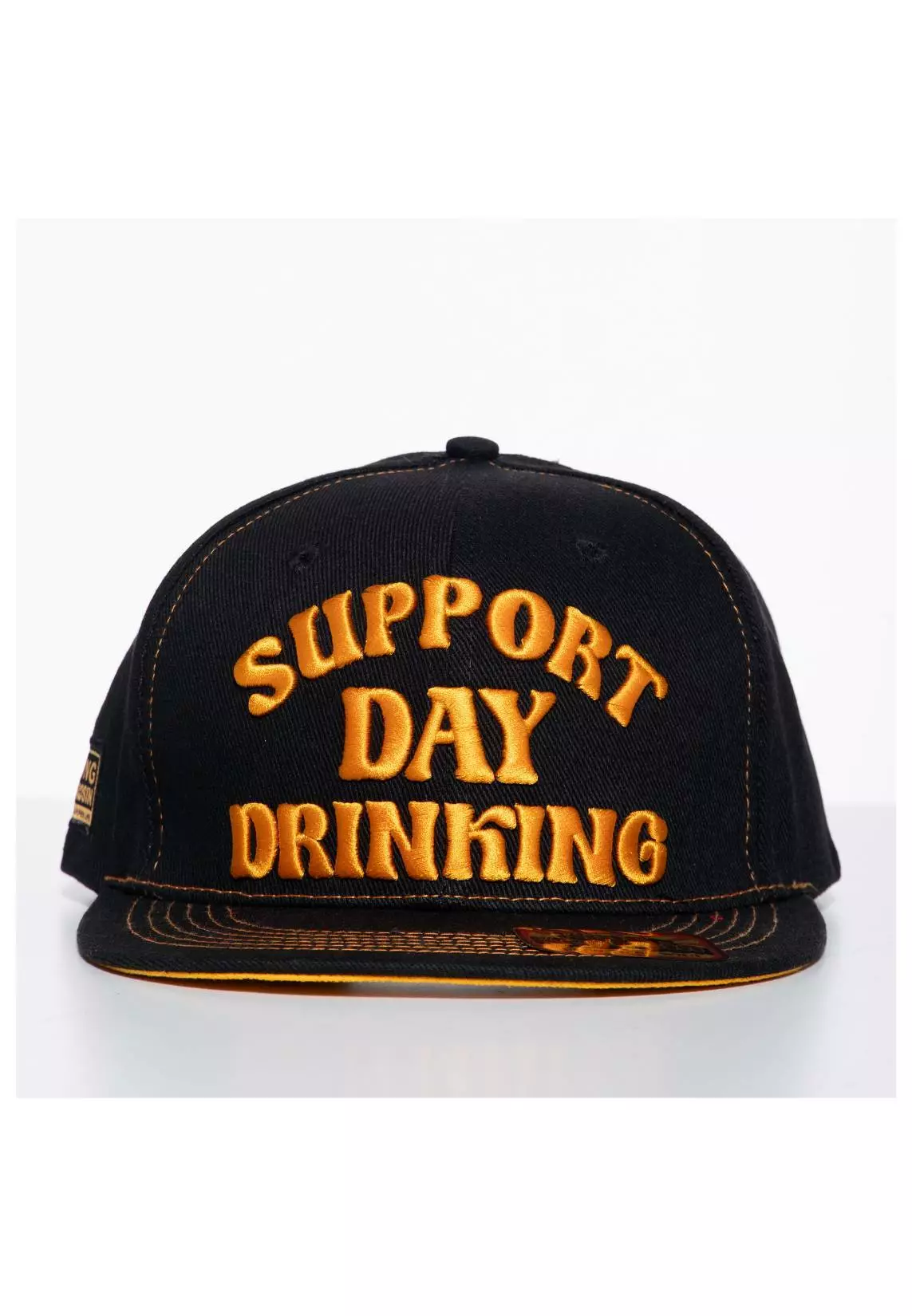 Lippis Support Day Drinking. Musta lippis, jossa oranssilla brodeerattu teksti edessä. Lippiksessä on suora lippa, jonka alaosa on oranssi ja siinä on musta printattu teksti. Koko on säädettävissä takaa.
