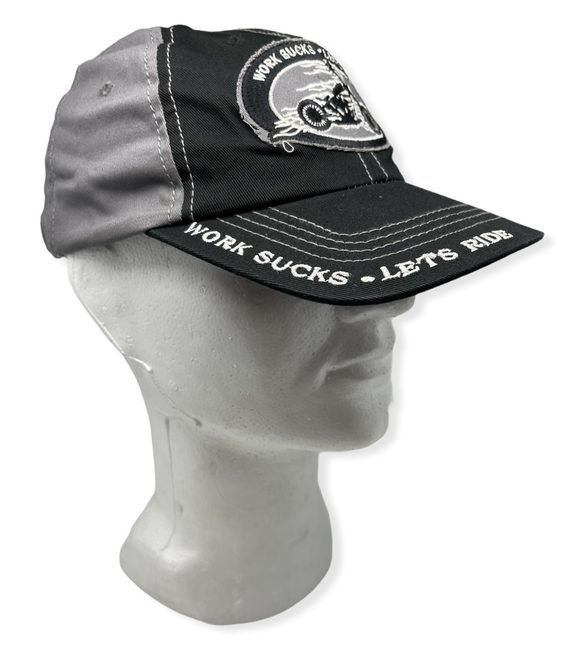 Lippis Work Sucks, Hot Leathers. Suoralippainen lippis, harmaa/musta, jossa mustaan lippaan brodeerattu valkoisella "Work Sucks - Let's Ride". Lipan pituus lippiksen etureunasta 7 cm. Lippiksen edessä ommeltu kangasmerkki. Takana koon säätömahdollisuus. Materiaali 100 % puuvillaa.