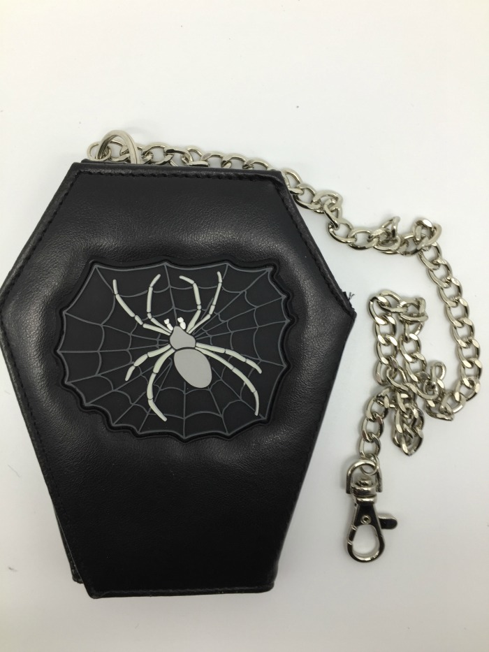 Lompakko, arkku, hämähäkki. Arkkulompakko, jossa päällinen tekstiilinahkaa, sisältä polyesteria. Lompakossa n. 45 cm mittainen, irroitettava ketju. Tarrakiinnitys. Sisällä pieni setelitasku, pieni kolikkotasku sekä kolme pientä taskua korteille. Yksi taskuista ikkunallinen.Lompakon koko 14 x 11 cm (avattuna 14 x 31 cm).