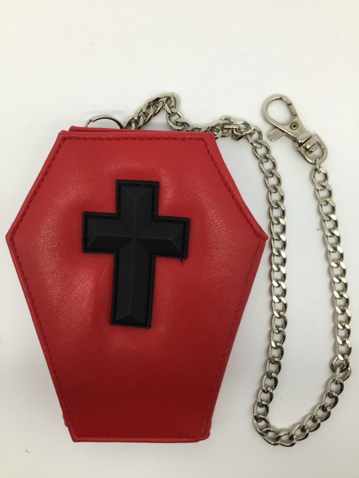 Lompakko, arkku, ristikuvio punainen . Arkkulompakko, jossa päällinen tekstiilinahkaa, sisältä polyesteria. Lompakossa n. 45 cm mittainen, irroitettava ketju. Tarrakiinnitys. Sisällä pieni setelitasku, pieni kolikkotasku sekä kolme pientä taskua korteille. Yksi taskuista ikkunallinen.Lompakon koko 14 x 11 cm (avattuna 14 x 31 cm).