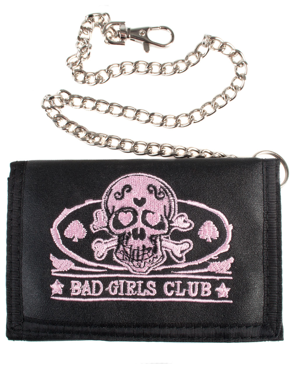 Lompakko, Bad Girls Club. Lompakko,jossa päällinen tekstiilinahkaa, sisältä polyesteria. Lompakossa 40 cm:n mittainen, irroitettava ketju. Tarrakiinnitys. Sisällä iso setelitasku, pieni kolikkotasku sekä kuusi pienempää taskua korteille. Yksi taskuista ikkunallinen. Lompakon takapuolella myös yksi vetoketjullinen tasku. Lompakon koko 13 x 8,5 cm (aukinaisena 13 x 25,5 cm).