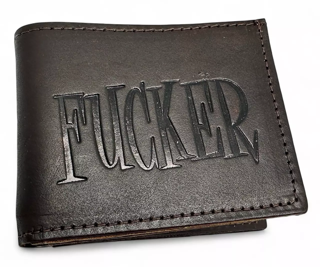 Lompakko Fucker, tummanruskea nahka. Mitat 10,5 x 8,5 cm.