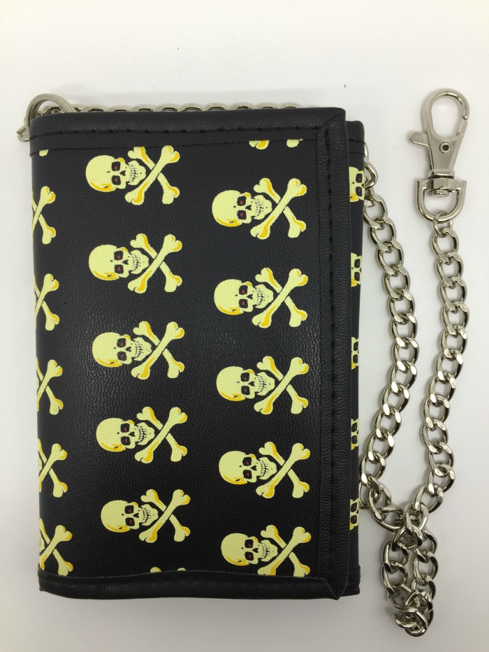 Lompakko, Kallo ja luut, ketjulla. Kompaktin kokoinen lompakko, jossa päällinen tekstiilinahkaa, sisältä polyesteria. Lompakossa n. 40 cm:n mittainen, irroitettava ketju. Tarrakiinnitys. Sisällä iso setelitasku, pieni kolikkotasku sekä kuusi pienempää taskua korteille. Yksi taskuista ikkunallinen. Lompakon koko 13 x 8,5 cm (aukinaisena 13 x 25,5 cm).