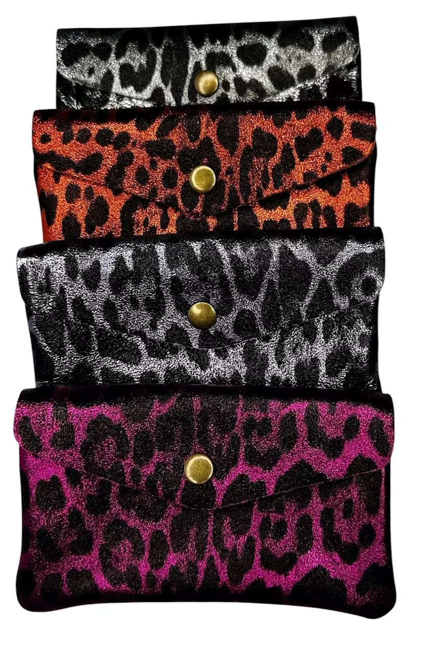 Lompakko Leopard, nahkaa. Metallinhohtoisena kimalteleva leopardikuvioinen nahkalompakko. Saatavana neljässä eri värissä. Mitat 15 x 9 x 2,5 cm.