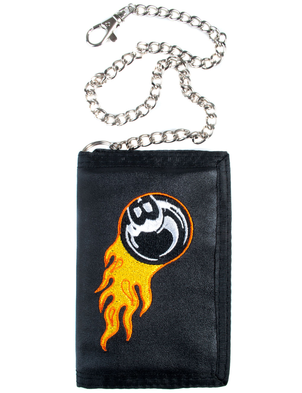 Lompakko, Liekki 8 pallo. Kompaktin kokoinen lompakko,jossa päällinen tekstiilinahkaa, sisältä polyesteria. Lompakossa 40 cm:n mittainen, irroitettava ketju. Tarrakiinnitys. Sisällä iso setelitasku, pieni kolikkotasku sekä kuusi pienempää taskua korteille. Yksi taskuista ikkunallinen. Lompakon takapuolella myös yksi vetoketjullinen tasku. Lompakon koko 13 x 8,5 cm (aukinaisena 13 x 25,5 cm).