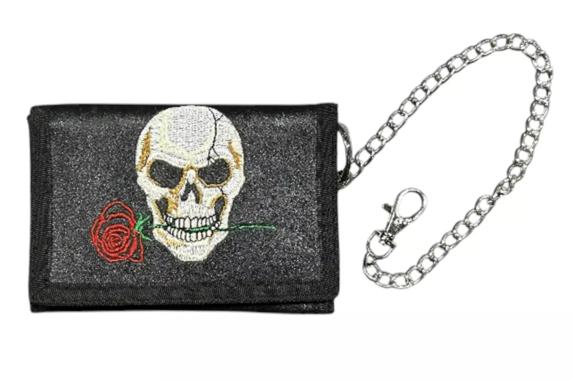 Lompakko, Pääkallo, ruusu hampaissa. Kangaslompakko, jossa ripustusketju. Saa kätevästi kiinni vaikka farkun vyölenkkeihin.