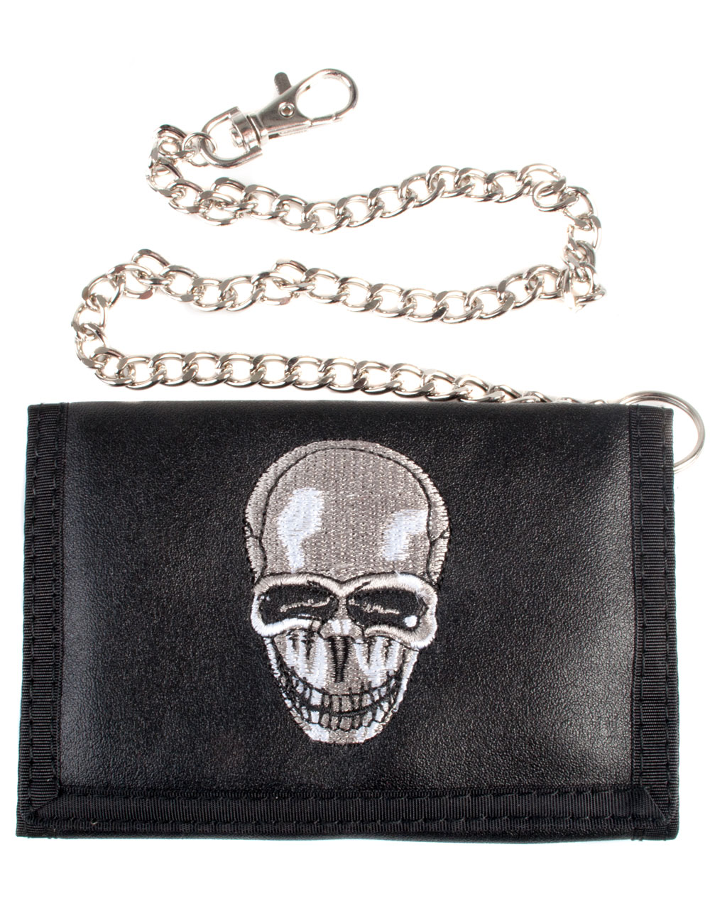 Lompakko, Pääkallo ketjulla. Kompaktin kokoinen lompakko, jossa päällinen tekstiilinahkaa, sisältä polyesteria. Lompakossa n. 40 cm:n mittainen, irroitettava ketju. Tarrakiinnitys. Sisällä iso setelitasku, pieni kolikkotasku sekä kuusi pienempää taskua korteille. Yksi taskuista ikkunallinen. Lompakon takapuolella myös yksi vetoketjullinen tasku. Lompakon koko 13 x 8,5 cm (aukinaisena 13 x 25,5 cm).