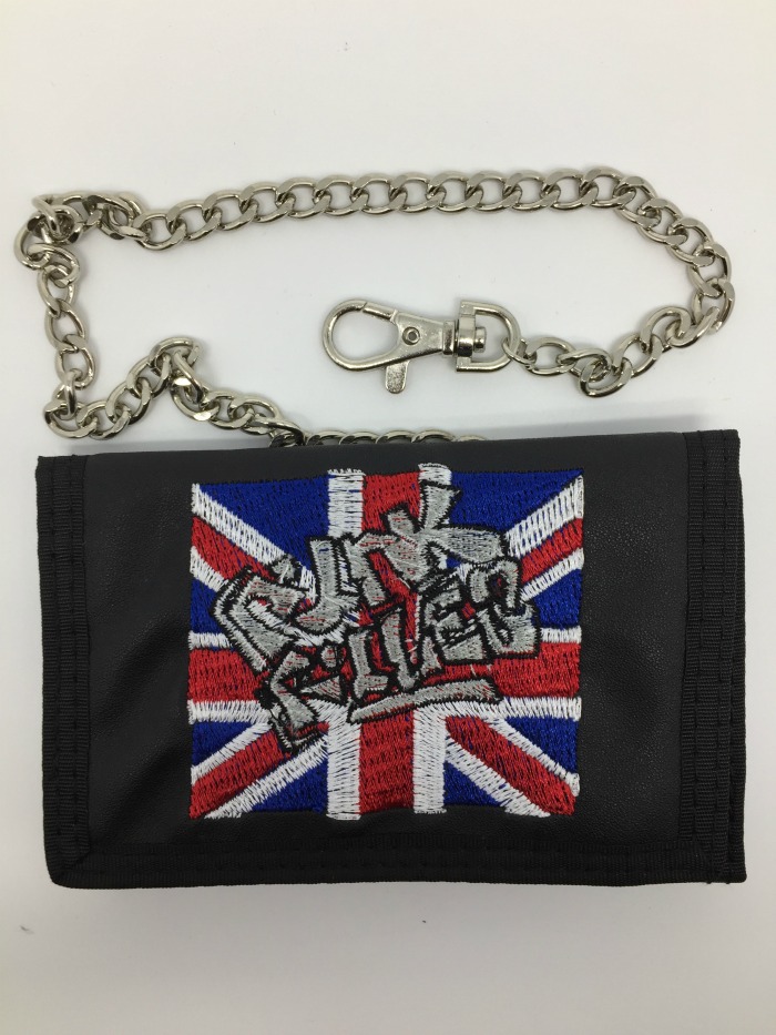 Lompakko, Punk, ketjulla. Kompaktin kokoinen lompakko, jossa päällinen tekstiilinahkaa, sisältä polyesteria. Lompakossa n. 40 cm:n mittainen, irroitettava ketju. Tarrakiinnitys. Sisällä iso setelitasku, pieni kolikkotasku sekä kuusi pienempää taskua korteille. Yksi taskuista ikkunallinen. Lompakon takapuolella myös yksi vetoketjullinen tasku. Lompakon koko 13 x 8,5 cm (aukinaisena 13 x 25,5 cm).