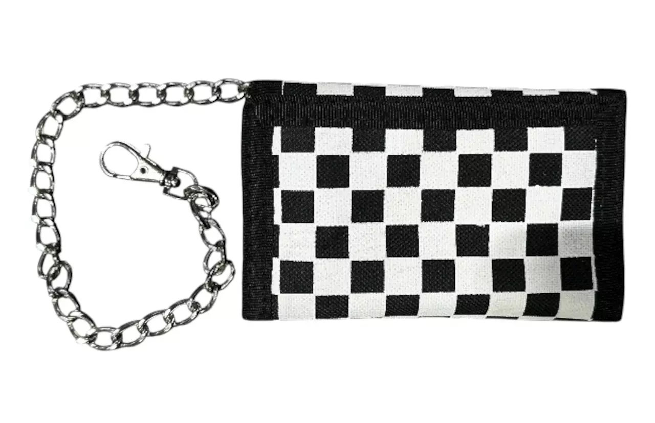 Lompakko, ralliruutu. Kangaslompakko mustavalkoisella ralliruutu-kuosilla. Lompakossa ketju, jolla sen saa kiinnitettyä housun vyölenkkeihin.