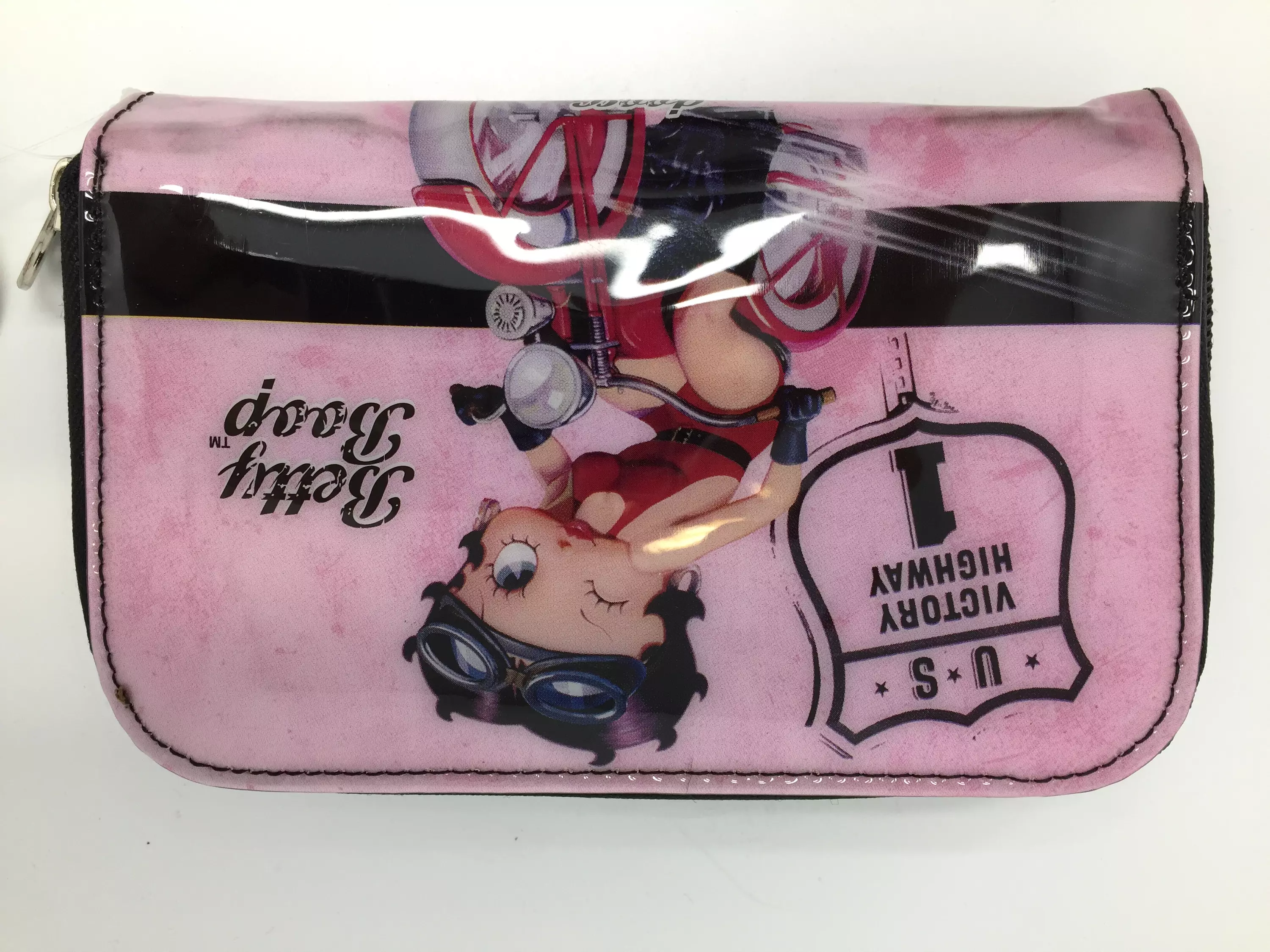 Lompakko vetskarilla, Betty Boop, Victor. Lompakon koko: Pituus 15 cm, leveys 3 cm ja korkeus 9,5 cm. Lompakossa runsaasti tilaa korteille, seteleille ja kolikoille.