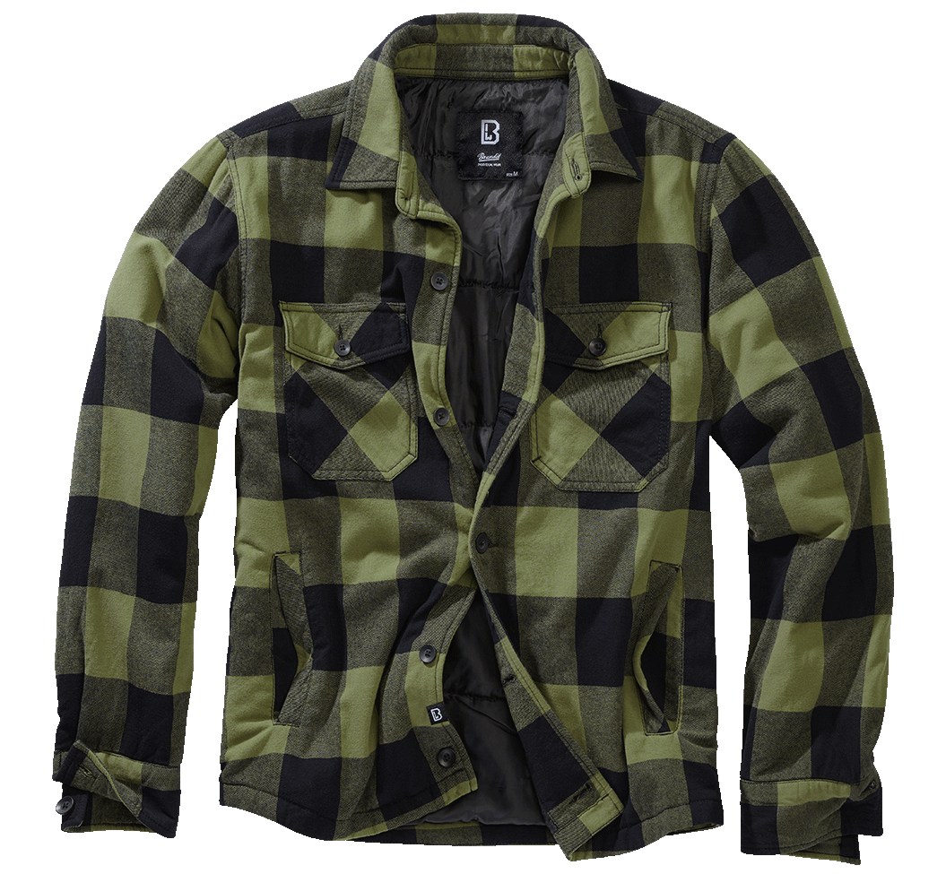 Toppavuorillinen oliivimusta Lumberjacket. Brandit napitettava, muhkea flanellitakki. Napilliset rintataskut, avonaiset etutaskut edessä, sekä povitasku vuorissa.