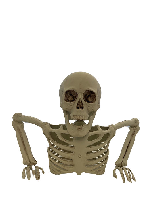Luurangon yläkroppa, mitat 40 x 19 x 27 cm. Laita luuranko esim. arkun päälle, jolloin näyttää että se työntyisi arkusta ulos. Vielä tehokkaamman vaikutelmasta saat kun viet luurangon pihalle nousemaan mullasta...
