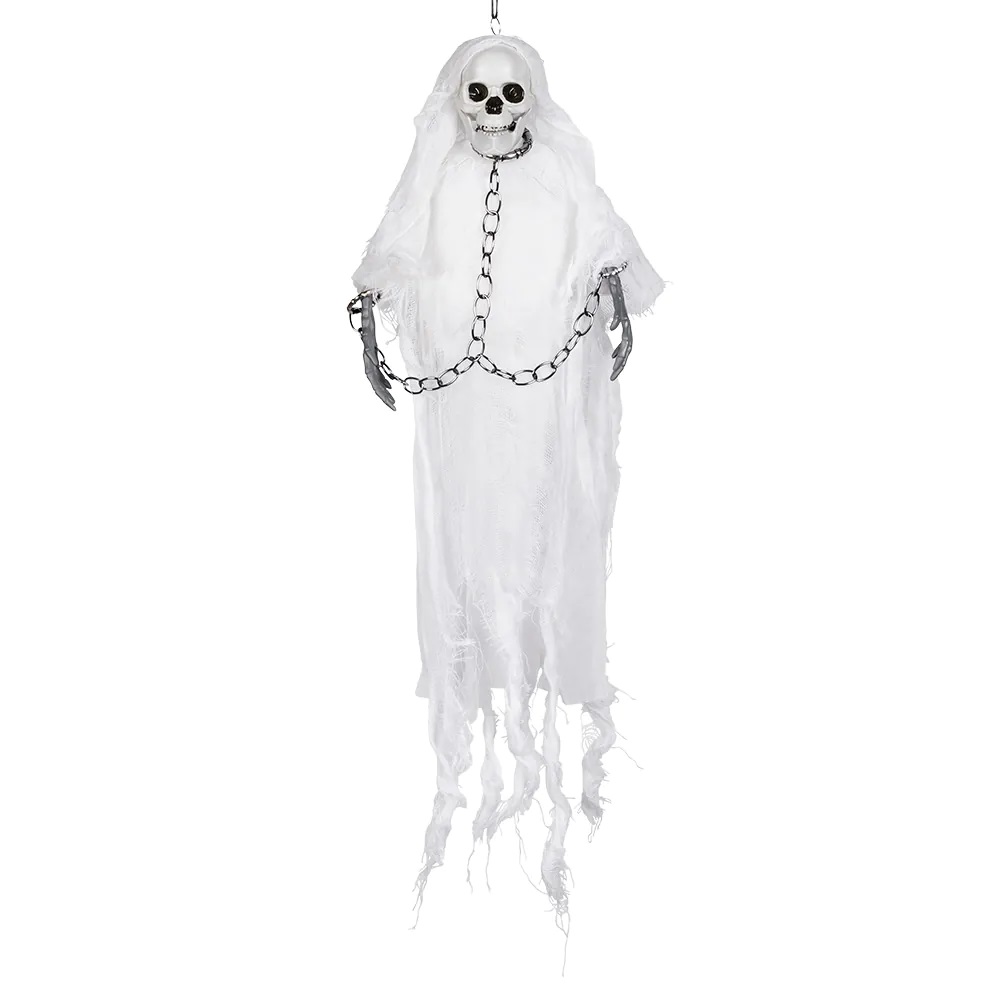 Luuranko valkoisessa kaavussa 40 cm. Roikkuva uudisraivaaja luurankokoriste.