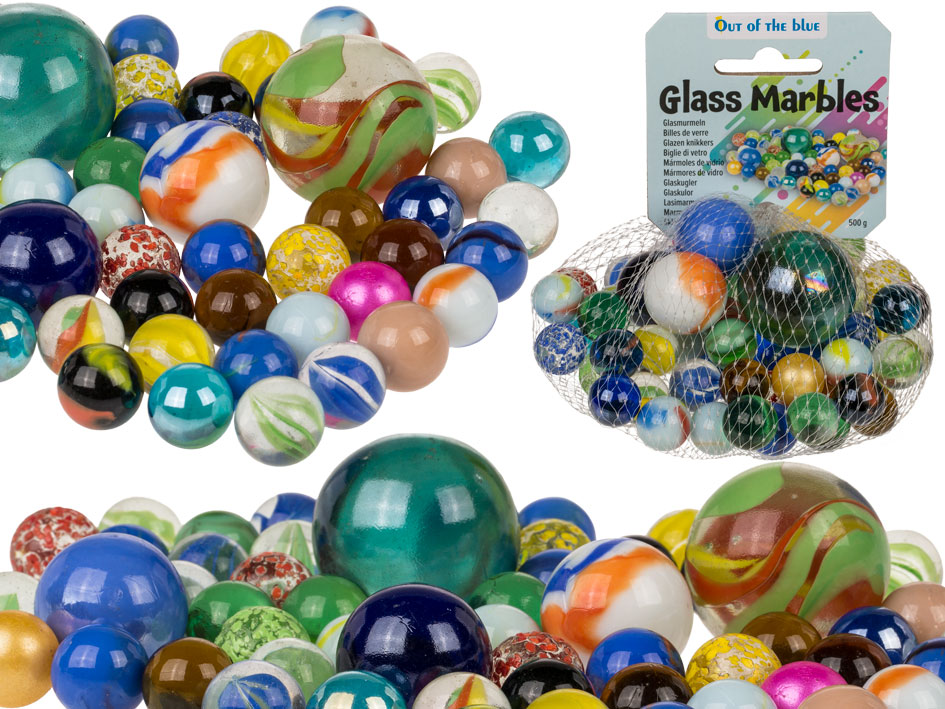 Glass marbles, multicoloured ass., 500 g per net with header card