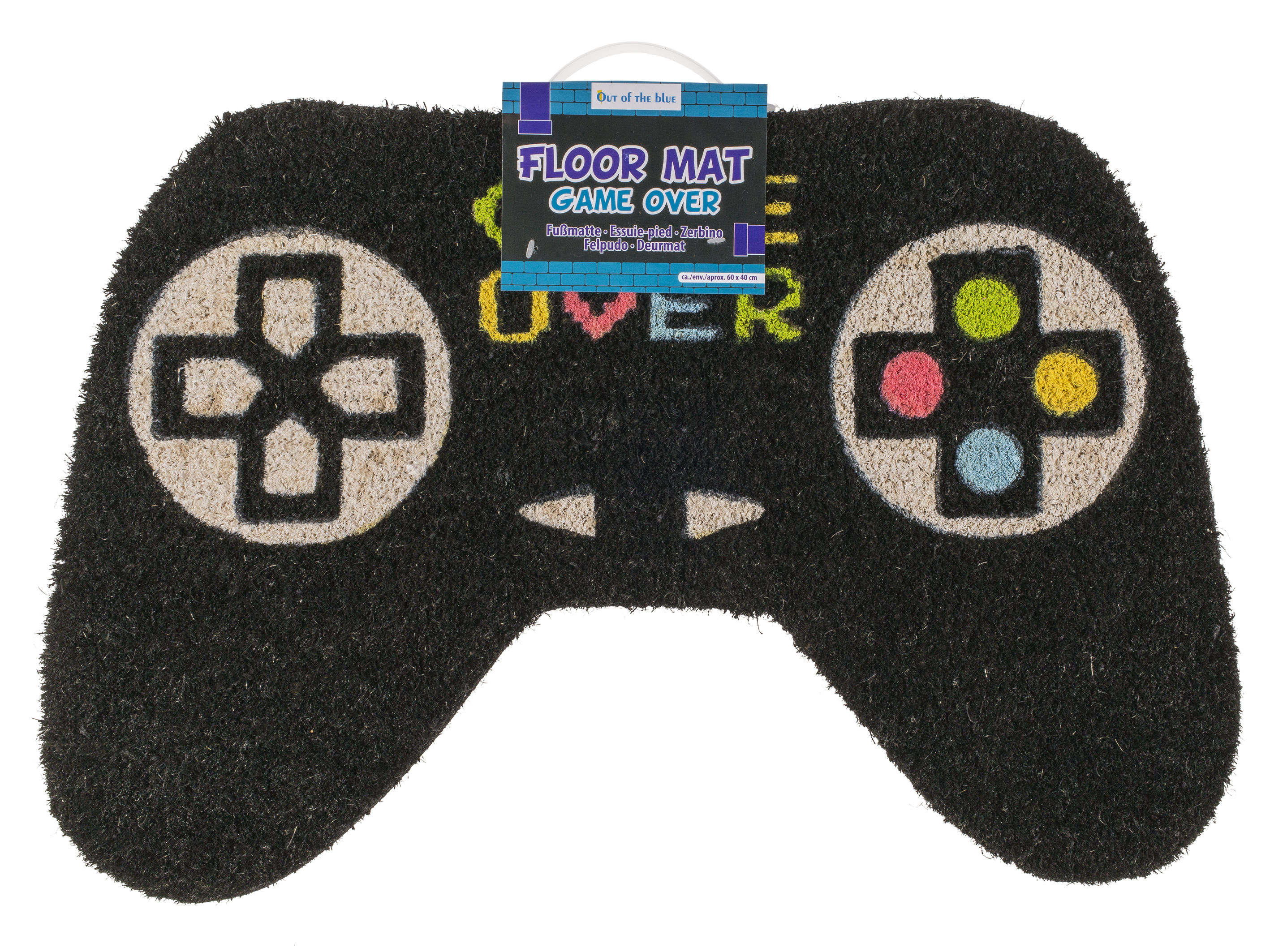 Matto pelimiehen oven eteen 60x40 cm. Kynnysmatto peliohjaimen muodolla ja nappuloilla. GAME OVER teksti yläreunassa.
