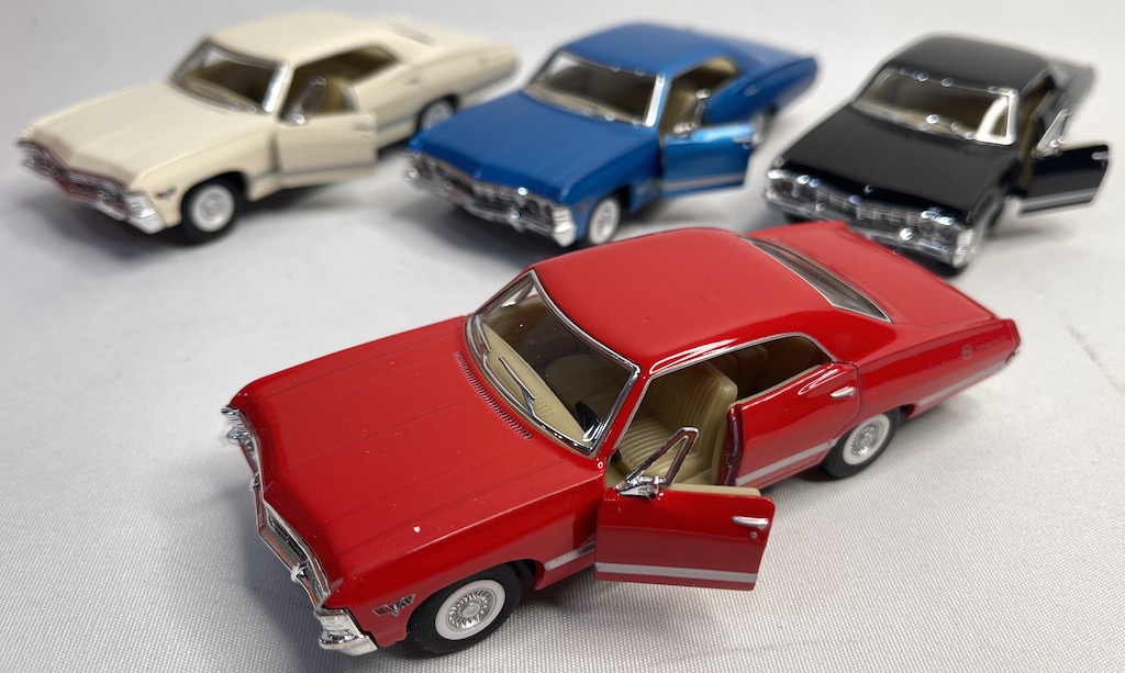 1967 Chevrolet Impala pikkuauto. Metallinen pienoismalli 1:43. Nostalginen Chevrolet, neljä värivaihtoehtoa, aukeavat ovet. Autossa pull back-toiminto (Eli auton saa liikkeelle vetämällä sitä... Lue lisää