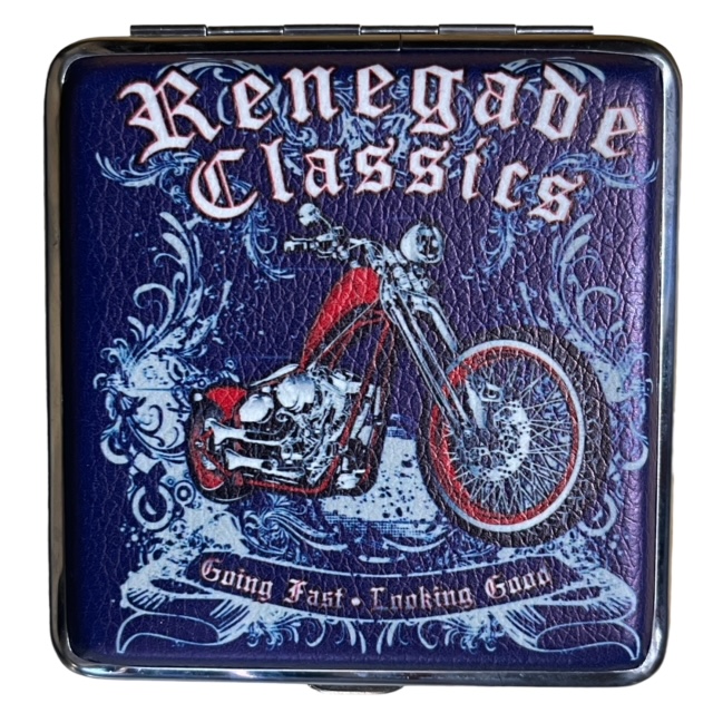 Metallirasia kuvalla. Metallirasian molemmin puolin nahkamaisessa päällisessä kuva. Mitat 95x95x20mm.