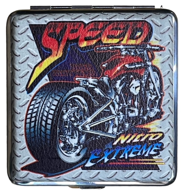 Metallirasia kuvalla. Metallirasian molemmin puolin nahkamaisessa päällisessä kuva. Mitat 95x95x20mm.