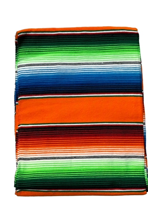 Mexico viltti oranssi raita sileä materiaali. Materiaali: Valmistettu kierrätetyistä kuiduista (akryyli-, polyesteri- ja puuvillasekoitus). Mitat 210x150cm. Made in Mexico..