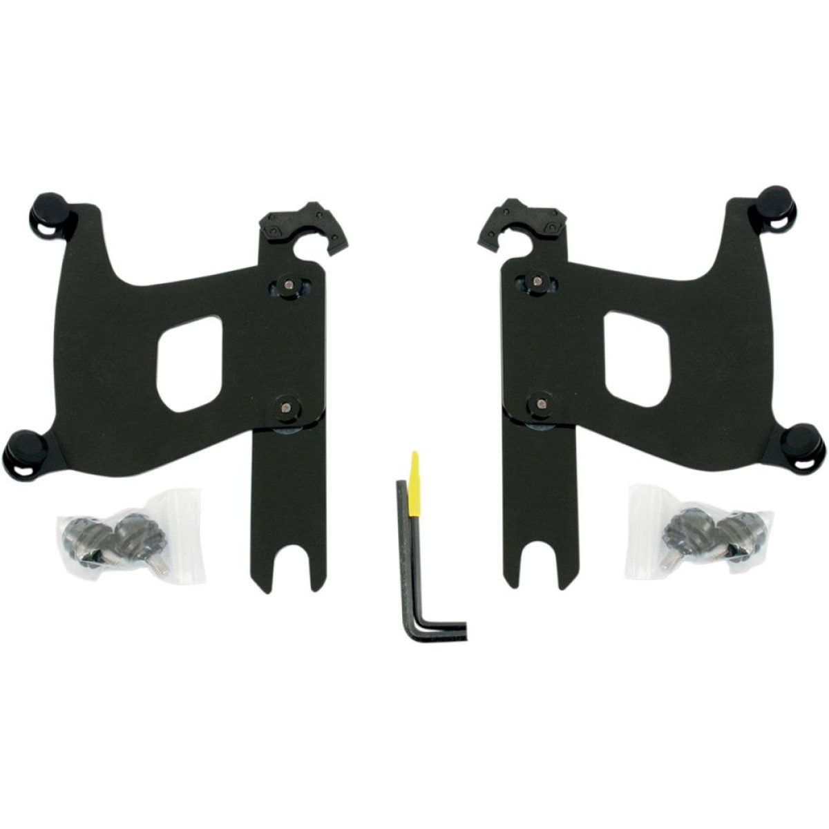 No-Tool Trigger-Lock mounting kits for Memphis Shades Windshields and Fairings. Gone are the days of fumbling with tools to remove your windshield. The revolutionary No-Tool Trigger-Lock hardware features an innovative system that allows you to quickly and easily remove your windshields without the use of any tools. A pair of latches lock the windshield down until the spring loaded “trigger locks” are intentionally disengaged, allowing the rider to remove the windshield. Hardware is fully adjustable to achieve just the right windshield angle. Kits are available in a combination of CNC-machined aluminum plates, stainless steel bolts and aluminum anchors, or black E-coated plates, bolts and anchors. Kits are custom-fit to each style of bike for a truly no-hassle installation. Made in the U.S.A.