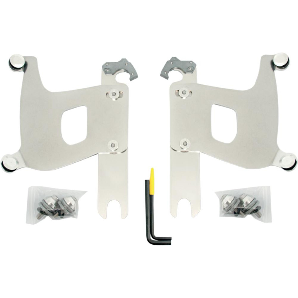No-Tool Trigger-Lock mounting kits for Memphis Shades Windshields and Fairings. Gone are the days of fumbling with tools to remove your windshield. The revolutionary No-Tool Trigger-Lock hardware features an innovative system that allows you to quickly and easily remove your windshields without the use of any tools. A pair of latches lock the windshield down until the spring loaded “trigger locks” are intentionally disengaged, allowing the rider to remove the windshield. Hardware is fully adjustable to achieve just the right windshield angle. Kits are available in a combination of CNC-machined aluminum plates, stainless steel bolts and aluminum anchors, or black E-coated plates, bolts and anchors. Kits are custom-fit to each style of bike for a truly no-hassle installation. Made in the U.S.A.