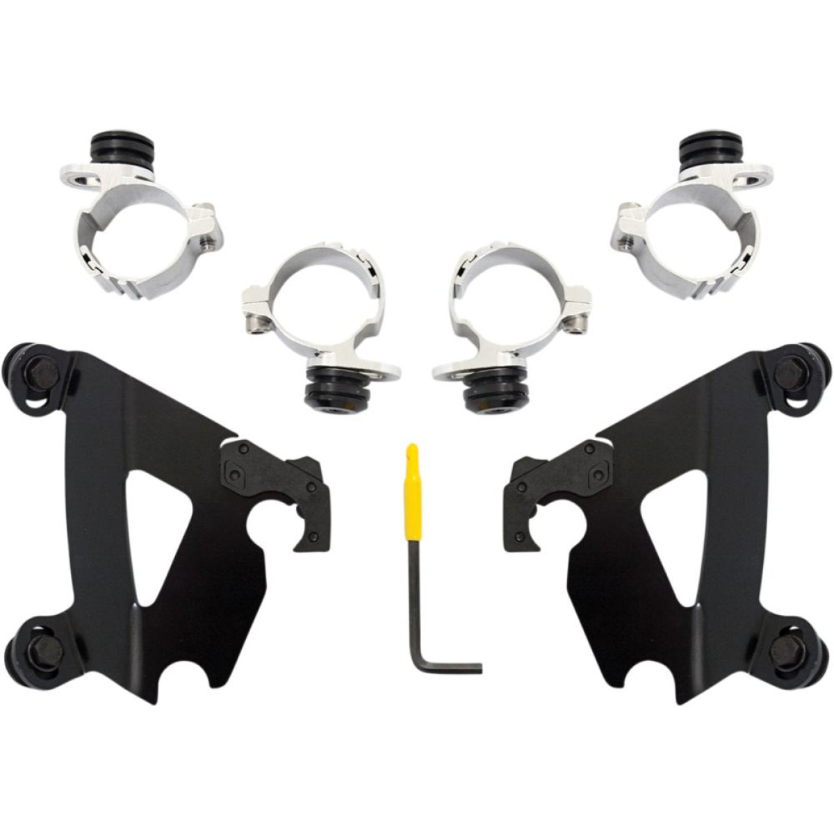 No-Tool Trigger-Lock mounting kits for Memphis Shades Windshields and Fairings. Gone are the days of fumbling with tools to remove your windshield. The revolutionary No-Tool Trigger-Lock hardware features an innovative system that allows you to quickly and easily remove your windshields without the use of any tools. A pair of latches lock the windshield down until the spring loaded “trigger locks” are intentionally disengaged, allowing the rider to remove the windshield. Hardware is fully adjustable to achieve just the right windshield angle. Kits are available in a combination of CNC-machined aluminum plates, stainless steel bolts and aluminum anchors, or black E-coated plates, bolts and anchors. Kits are custom-fit to each style of bike for a truly no-hassle installation. Made in the U.S.A.