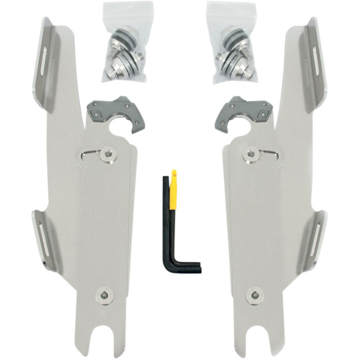 No-Tool Trigger-Lock mounting kits for Memphis Shades Windshields and Fairings. Gone are the days of fumbling with tools to remove your windshield. The revolutionary No-Tool Trigger-Lock hardware features an innovative system that allows you to quickly and easily remove your windshields without the use of any tools. A pair of latches lock the windshield down until the spring loaded “trigger locks” are intentionally disengaged, allowing the rider to remove the windshield. Hardware is fully adjustable to achieve just the right windshield angle. Kits are available in a combination of CNC-machined aluminum plates, stainless steel bolts and aluminum anchors, or black E-coated plates, bolts and anchors. Kits are custom-fit to each style of bike for a truly no-hassle installation. Made in the U.S.A.