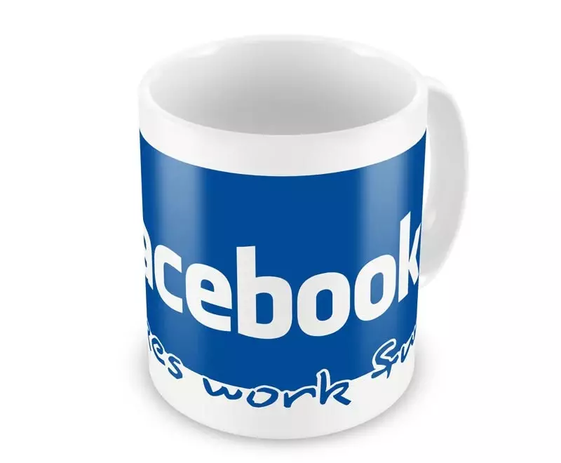 Muki Facebook, vetoisuus 300 ml. Mukissa valkoisella pohjalla Facebook-logo ja teksti "Facebook make work fun !"