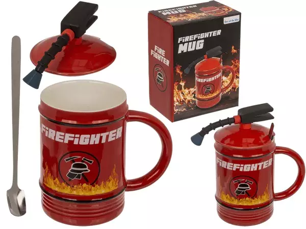 Muki Fire Fighter, sis. kansi ja lusikka. Keraaminen palomiehen muki, jossa tulee mukana tyyliinsopiva kansi ja lusikka. Mukin koko on noin 8 x 14 cm, tilavuus 450 ml.