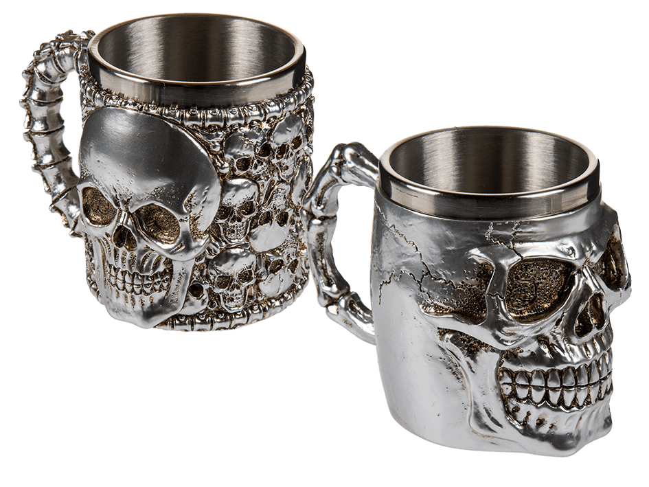 Pääkallo teräskuppi/ snapsilasi. Tyylikäs teräskuppi, joka on päällystetty upealla kohokuvioidulla polyresiini-pinnoitteella. Korkeus 6 cm ja pohjan halkaisija 4 cm.