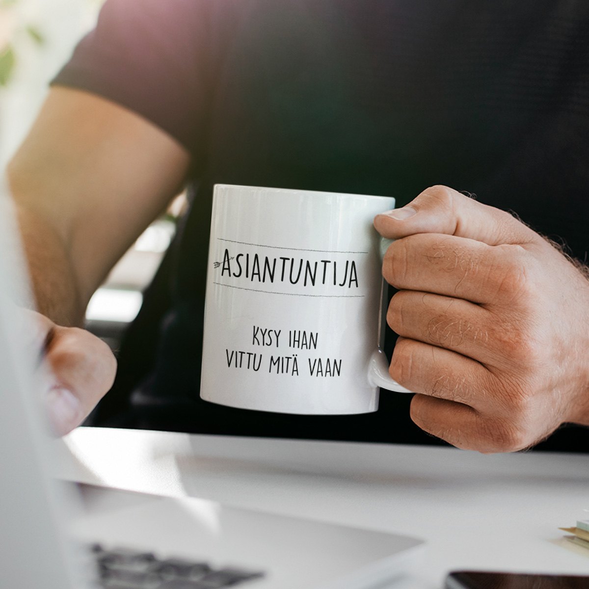 Muki, Kaikkitietävä asiantuntija. Kun vaan tietää vittu IHAN KAIKEN. Tai ainakin on tietävinään. Mitä väliä, mutta tämä muki ilmiantaa Asiantuntijan, kysy vaikka. Vetoisuus 330 ml, konepesunkestävä.