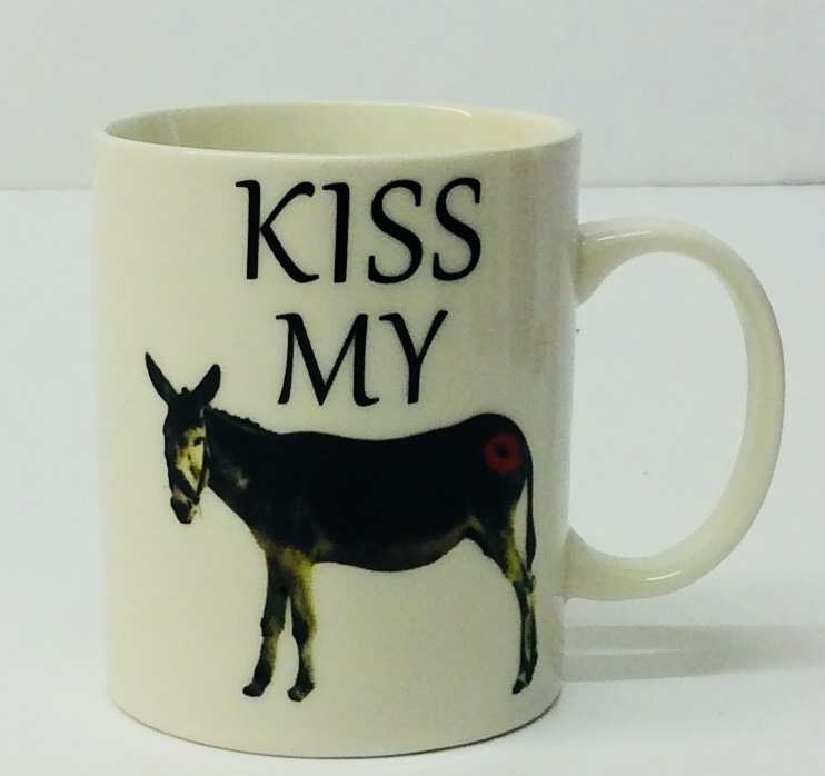 Muki, Kiss my..., valkoinen. Valkoinen muki tekstillä ja kuvalla. Mukin tilavuus n. 3 dl.