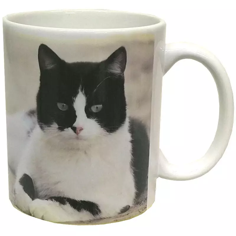 Muki Kissamuki, mustavalkoinen kissa. Konepestävä muki, lasitettua posliinia. Korkeus 9,5 cm, tilavuus n. 3 dl. Toimitetaan kartonkisessa lahjapakkauksessa.