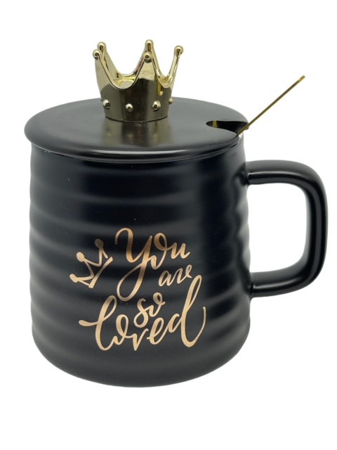 Muki Kruunu You Are So Loved. Muki kannella ja lusikalla. Musta muki, jossa kansi, lusikka, kruunu koriste ja kullattu teksti etupuolella. Vetoisuus reilu 300 ml. Suositellaan käsinpesua.